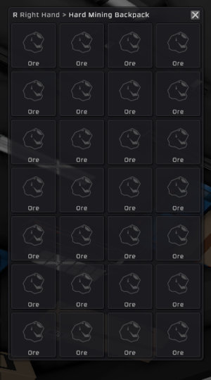 A slightly larger version of the Mining Backpack with 28 slots for Ore. This is worn in the back (4) slot, but does not have jetpack capability. Since all the slots are ore slots, you will have store other items in your uniform, or your belt (if it has the appropriate slots).
