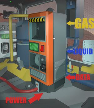 This kit is used to construct an Ice Crusher which can process ice chunks into liquids and/or gases. The Ice Crusher has two outputs at the back. The top port can be connected to Pipes (yellow) and the lower port can be connected to Liquid Pipe (blue) to extract the products. The top pipe output is for Gas, and the lower pipe output is for Liquids. A dial on the front can be used to set the output temperature. The Ice Crush will use heat the gas and liquids in it's internal reservoir to the selected temperature.