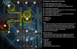 A problem with this setup is that it will continue to add oxygen even if the volatile storage is empty, which will ruin the fuel ratio. This can be fixed either by adding a valve (infront of the volume pumps so it doesn't blow the pipe) for manual control of the oxygen flow, or by adding circuits to shut it off. Another issue is that tweaking the memory values while the system is running can cause the fuel tank to overpressurize and burst, keep suspects with screwdrivers away from the area.
