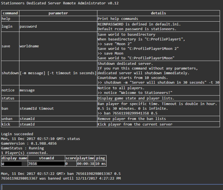 | ban | steamId timeout | Ban player for specific time. Timeout is double in hour. 0.5 is 30 minutes. 0 is infinite. >> ban 76561198299941358 0.5 |